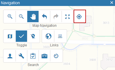 The map allows users to view their current location. This is helpful for users out in the field. The Navigation map tool is a floating panel on the map. See Navigation Fields for more information on this panel.