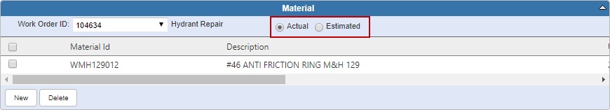 - Select Predefined to view the estimated material that the administrator has configured for all work orders of this type. Once you select Predefined, the page reloads and the predefined material shows. Select the desired material by selecting the check box next to the UID.
