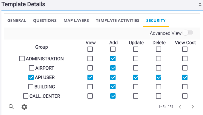 Template Security is used to set the group access rights for the service request template. Permission is given to view, add, update, delete, or view cost.