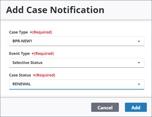 If you select Selective Status for the Event Type, a Case Status drop-down list will appear in the Add Case Notification panel, and must be populated before continuing.