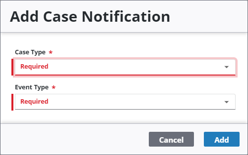 - On the Add Case Notification panel, use the drop-down list to enter a Case Type and an Event Type.