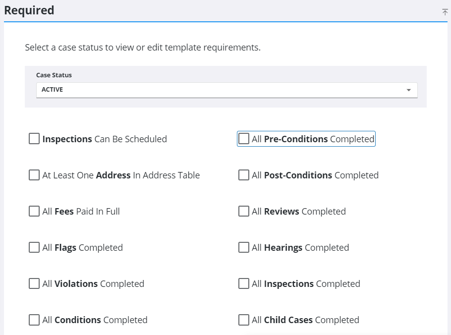 1. If you want to add required items to other Case Status codes for this case template, repeat the above steps after selecting the new case status from the drop-down list.
