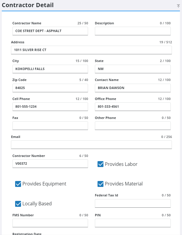 For an explanation of fields on the Contractor Details panel, see Contractor Fields.