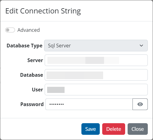 TIP: You can also select the Advanced option and enter the Server, Database, User, and Password in a string instead of using the fields.
