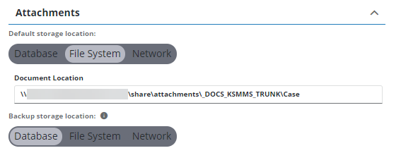 • Network: Attachments will be stored in a file on the network. Enter the network file path to set this value.
