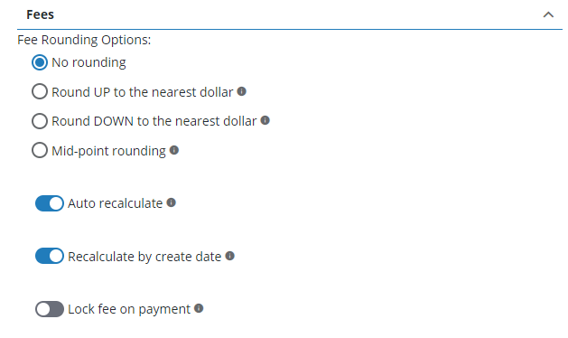 Administrators can control whether the Auto Recalculate, Recalculate by Create Date, and the Lock Fee on Payment switches on the Fee Setup panel are turned on or off by default.