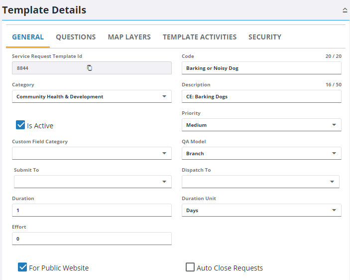 NOTE: The Code must be unique. Duplicate service request template codes are not allowed, even across different domains.