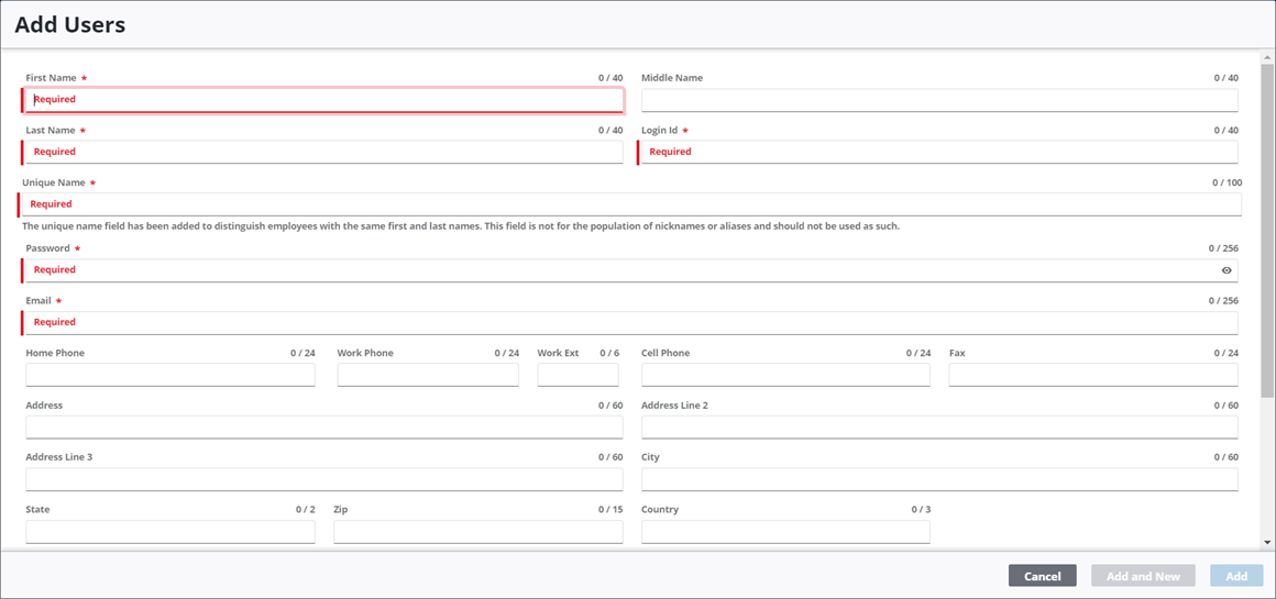 - On the Unique Name field, enter an additional name, if needed, to distinguish the new employee from one or more existing employees who have the same first and last name.