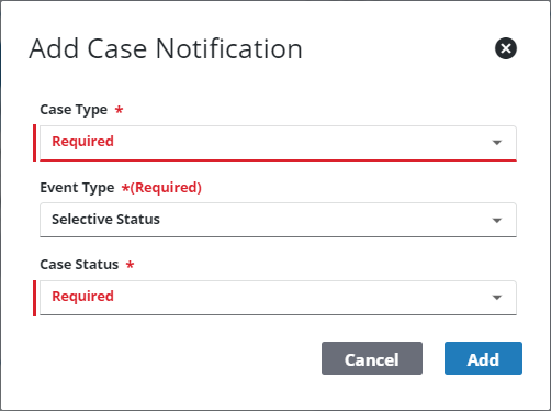 If you select Selective Status for the Event Type, a Case Status drop-down list will appear in the Add Case Notification panel, and must be populated before continuing.