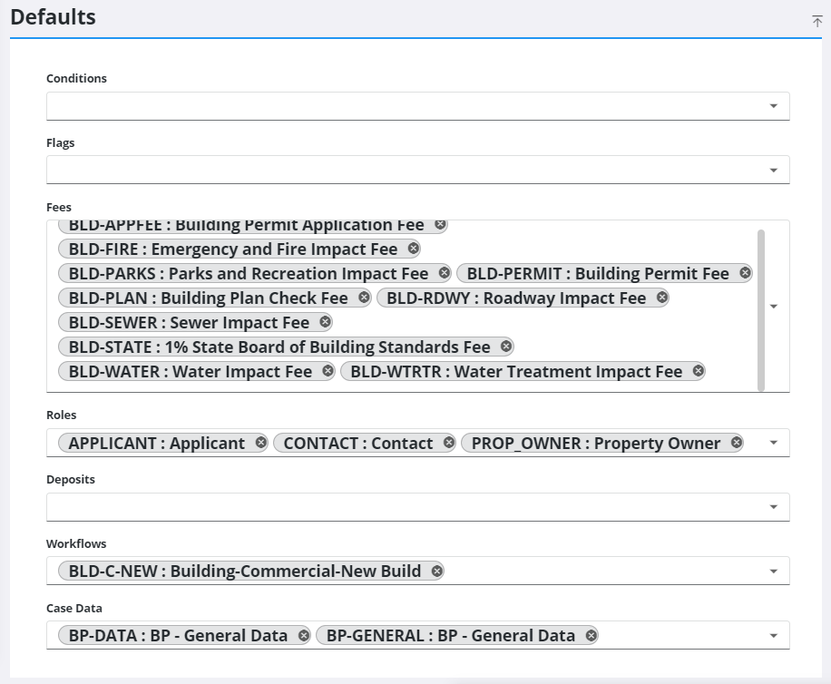 The Defaults panel allows PLL administrators to set default parameters for cases based on the template you are creating. You can assign conditions, fees, flags, people roles, a workflow, and case data groups to the template depending on the type of permit or application the template is designed for.