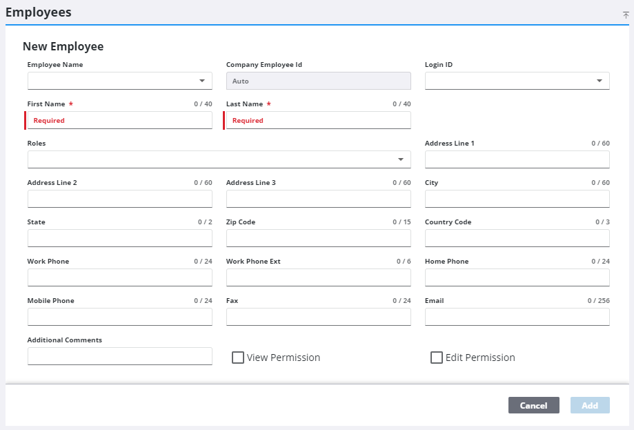 - In the New Employee section, enter a first name, last name, and any supporting information you want to include in the additional fields.