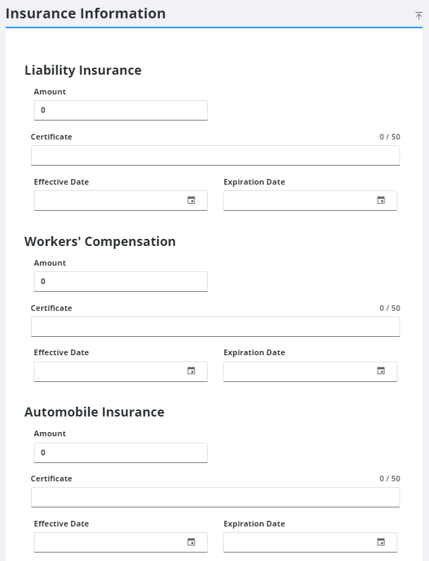 - In the Insurance Information panel, enter the information about the contractor's insurance.