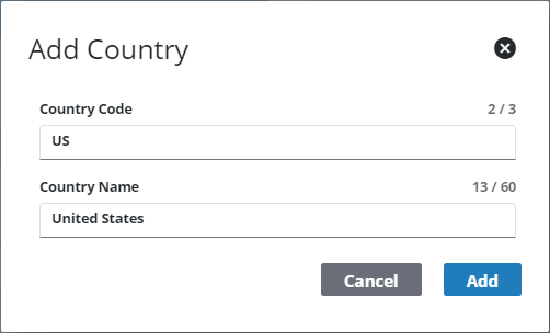 - On the Add Country panel, enter a unique name in the Country Code field and update the Country Name as desired.