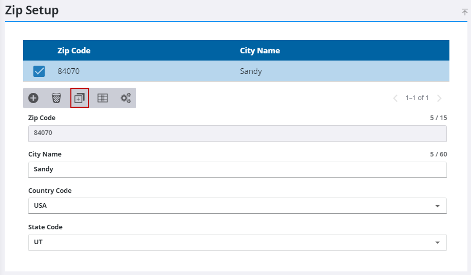 - On the Zip Setup panel, select the entry you want to clone and click Clone selected records.
