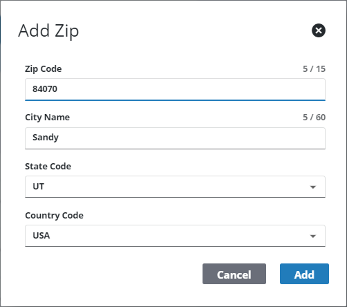 - On the Add Zip panel, update the Zip Code, City Name, State Code, and Country Code fields as desired.