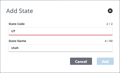 - On the Add State panel, enter a unique name in the State Code field and update the State Name field as desired.