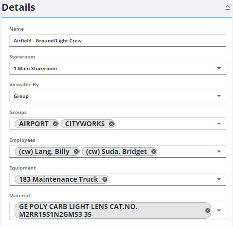 1. Select a Storeroom for the crew if your organization uses Storeroom. The Storeroom selected is the storeroom that material is issued from when the crew is added to a work order.