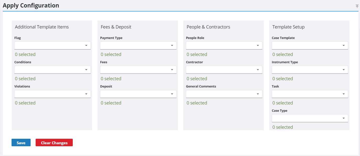 - On the Apply Configuration panel, use the drop-down lists to designate which template components the custom fields in the column displays on.