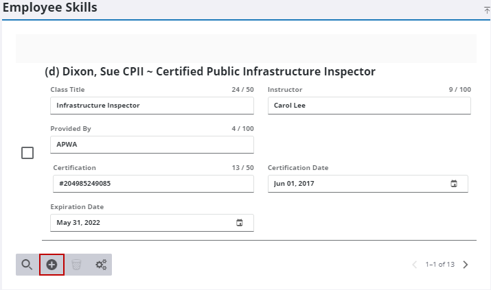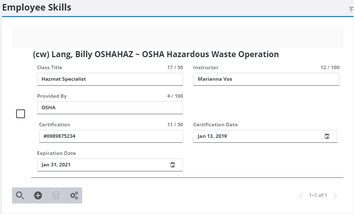 The new employee(s) display in the Employee Skills panel along with the details of their certification.