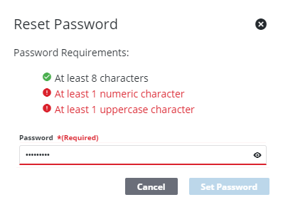 If any password requirements have been set by the administrator, the user sees all of the requirements they must meet while creating a password, as well as an X or a green check mark to indicate whether or not the password is acceptable. You cannot click Set Password until the password meets the requirements set by the administrator. See Configure Global Preferences for more information.