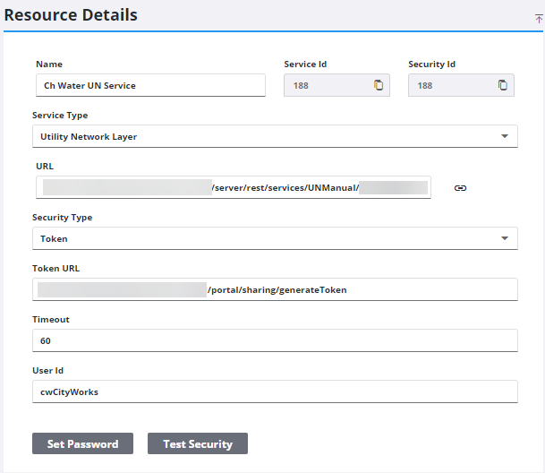 - Enter the URL of the service. The URL is a combination of two URLs from an Esri Utility Network GIS service. First, copy the URL of the Utility Network service (ending in /UtilityNetworkServer), then locate the layer ID of the utility network layer in the FeatureService in the same folder of the ArcGIS Services Directory. Copy the layer ID from the URL and add it to the base URL (for example, .../UtilityNetworkServer/12).