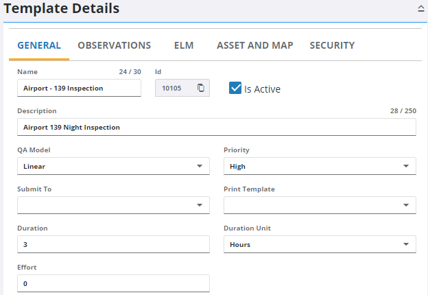 For an explanation of fields on the General tab, see Inspection Template Fields.