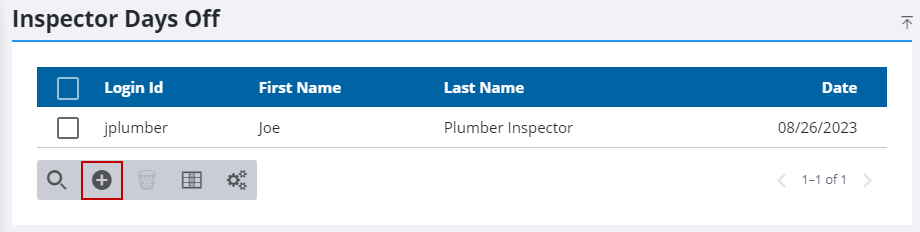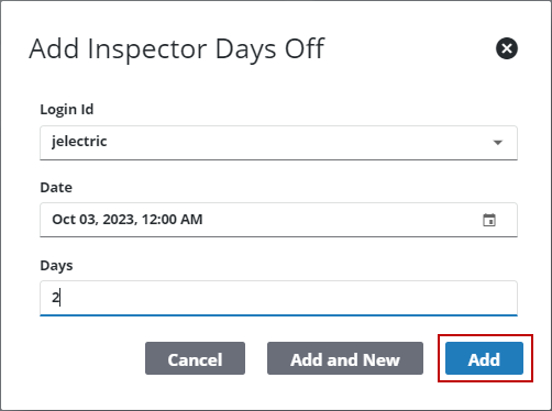 - On the Add Inspector Days Off Panel, select an inspector using the Login Id drop-down list.