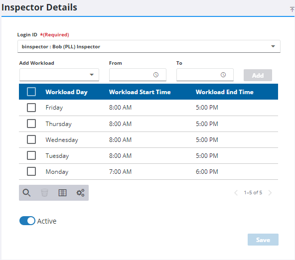 - To set the inspector's workload, select a day of the week from the Add Workload drop-down list.