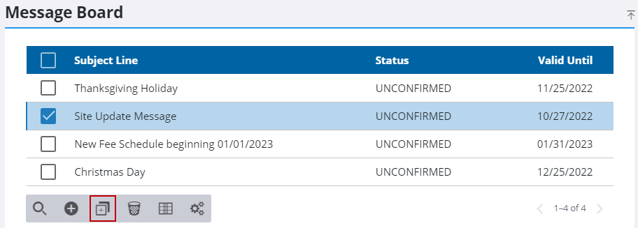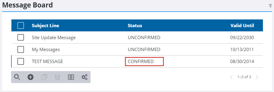 Turning the Confirm switch on or off updates the Status column on the Message Board panel to provide visibility of the publication status of the message.