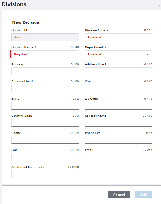 IMPORTANT: While the Division Code and Division Name fields are the only fields required to create a new division, it is important to provide as much of the additional information as possible. These additional fields identify the contact information for the division.