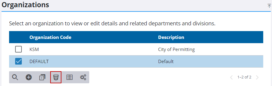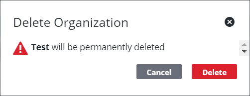 An existing organization can be deleted if necessary, but users should exercise extreme caution when doing so. Deleting an organization will also delete any department or division records attached to it. Users should move any existing departments or divisions into other organizations before deleting the parent organization.
