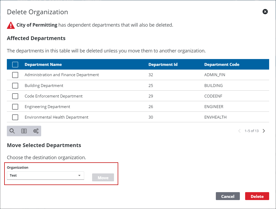 1. If applicable, select the check boxes next to the departments you want to move, then select a new organization from the Organization drop-down list and click Move.