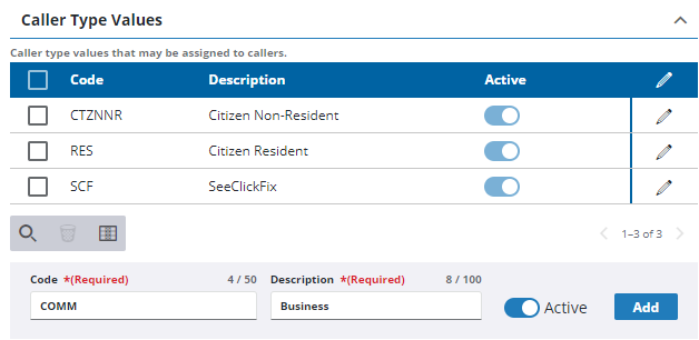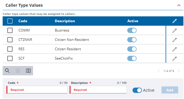 - At the bottom of the Caller Type Values section, enter the Code and Description.