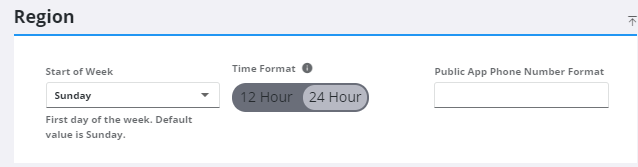 The Region settings allow you to select the start of the week, set a time format that is displayed in Cityworks and in data exported from Cityworks, and set the phone number format in Public Access.