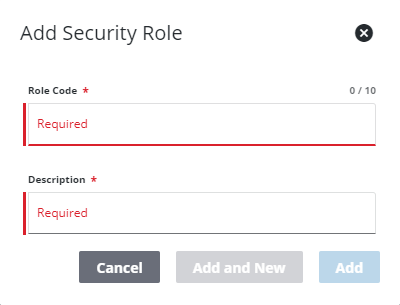 - In the Add Security Role panel, enter a Role Code and Description for the new security role and click Add. The new role will appear in the Security Roles panel.
