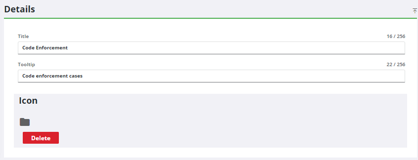 - To add an image, either click the box in the Icon section to browse to the file or drag a file and drop it where it says Drag a svg icon here (or click) to upload.
