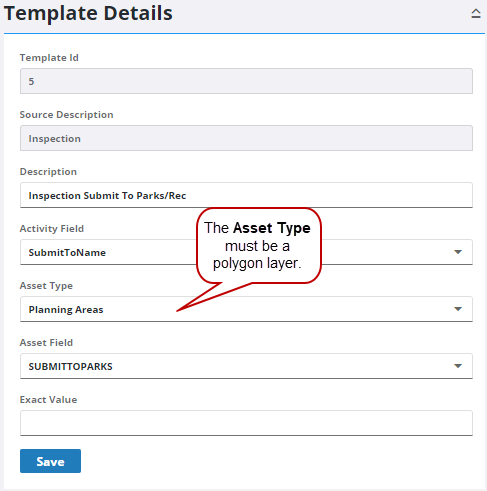 IMPORTANT: The Asset Type selected must be a polygon layer. Action Manager is not designed to work with point or line layers, and object tables. Fields cannot be populated based on the assets attached to the work activity, just the boundary the activity falls in—which is why a polygon layer must be selected.