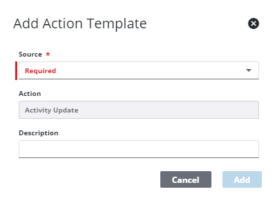 Any existing activity update templates appear with the Source listed to the right of the template name. Any templates that are not associated to an Action Event appear grayed out in the list.