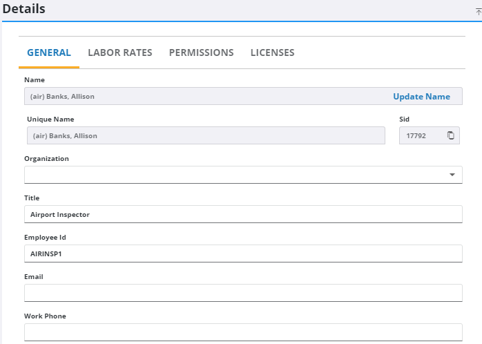For an explanation of fields on the General tab of the Details panel, see Employee Fields.