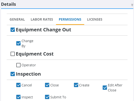 You can also select the check box next to Equipment Change Out, Equipment Cost, Inspection, Project, Service Request, Search, Storeroom, Task, or Work Order to assign the employee all of the permissions for that type of work activity.