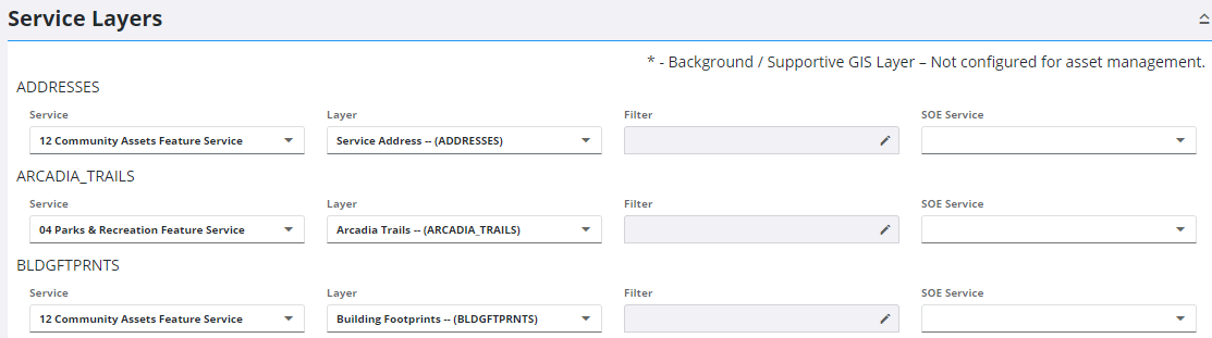 NOTE: *-Background/Supportive GIS Layer- Not Configured for Asset Management indicates that the layer isn't defined as an asset in Cityworks but can still be used for service request questions and answers, as well as service request, work order, or inspection map layers.