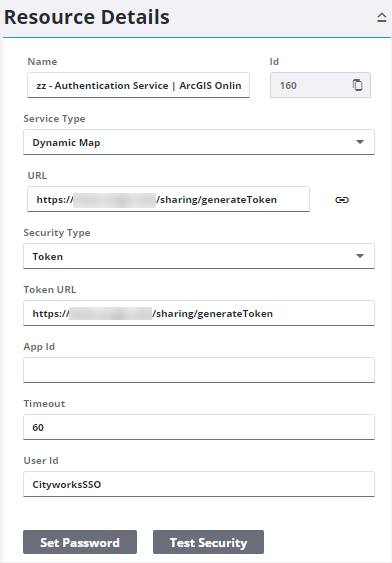 - Enter the Token URL that Cityworks uses to get the token. This URL is based on the name of your Esri server.