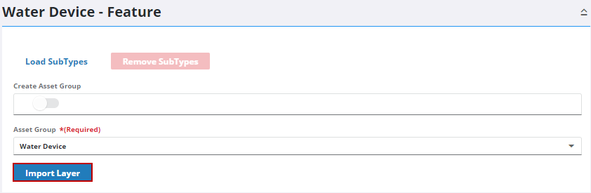 The layer, in this case Water Device, becomes the asset group, and any subtypes added are added as asset types under the new asset group. See Add or Edit an Asset Group for more information.