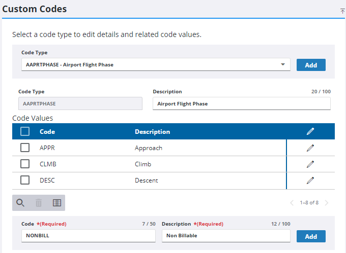 - Select an existing Code Type to view the code values.