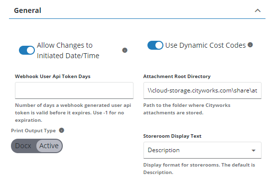 1. For the Print Output Type, select either Docx or Active. If you select Docx, service requests, work orders, and custom inspections are printed as Microsoft Word .docx files. The templates must be stored at ...\inetpub\wwwroot\<site_name>\cw-site-data\_tenant-data\_default-volume\tenant-1\docx. If you select Active, the records are printed as ActiveReports PDFs. The templates must be stored at ...\inetpub\wwwroot\<site_name>\cw-site-data\_tenant-data\_default-volume\tenant-1\reports. The default is Docx.