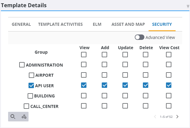 Template Security is used to set the group access rights for the work order template. Permission is given to view, add, update, delete, or view cost.