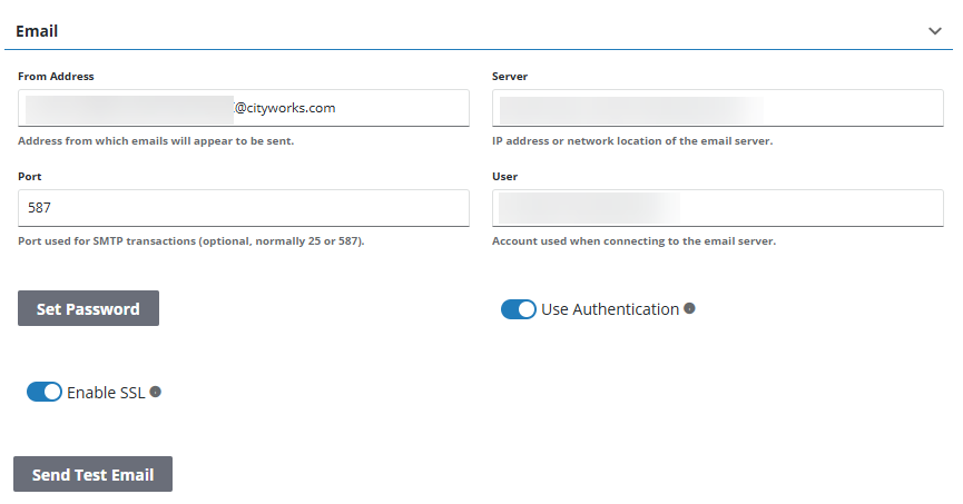 IMPORTANT: For Cityworks Online clients, if Trimble hosts your email server, do not update the From Address because it can cause issues with emails being sent or received.