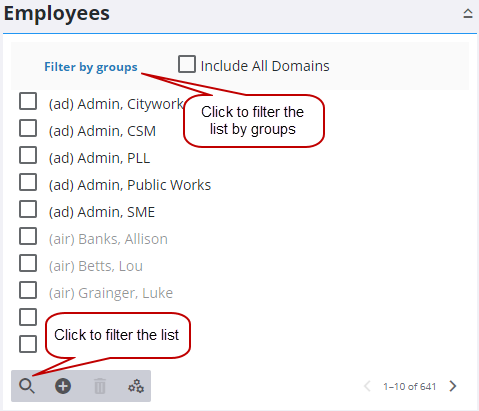 The Employee panel lists all employees and their logins. Any employees that are inactive appear grayed out in the list.