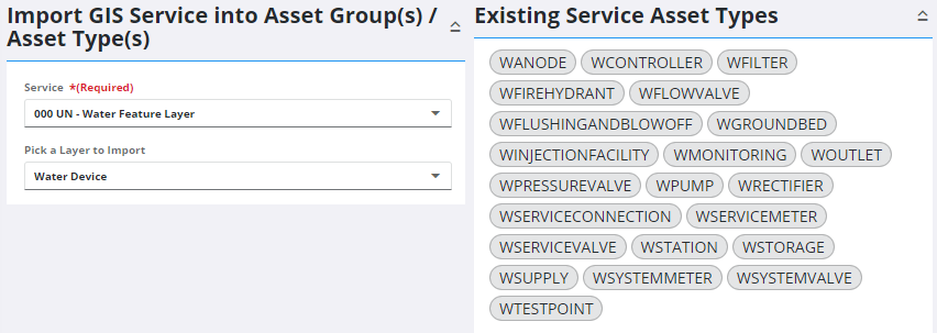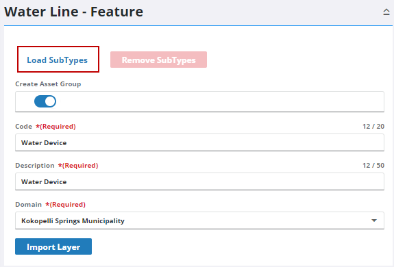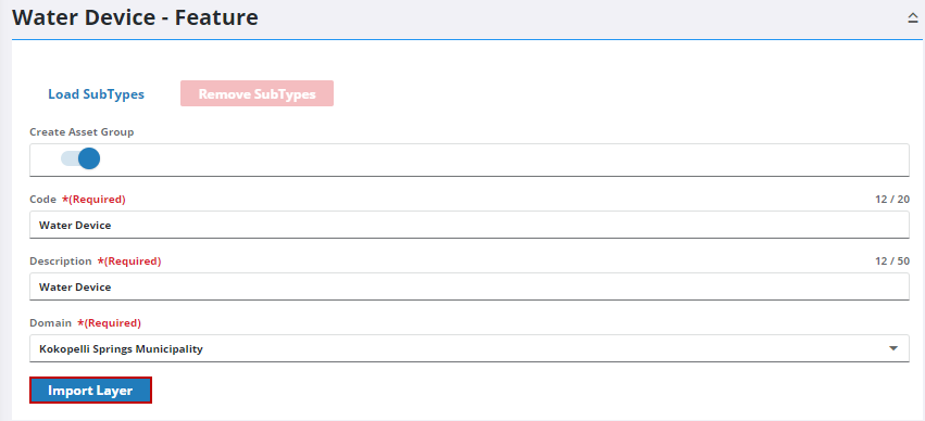The layer, in this case Water Device, becomes the asset group, and any subtypes added are added as asset types under the new asset group. See Add or Edit an Asset Group for more information.