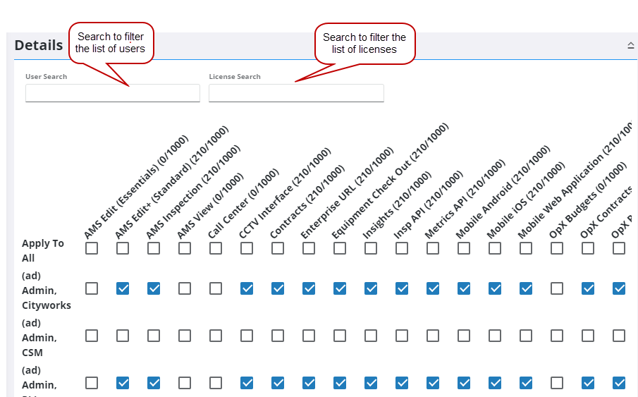 The Details panel lists each user and the rights of each user. You can filter this panel by typing the first few letters of the user's name in the row search (users) box at the top of the panel, or by typing the first few letters of the license in the column search (licenses) box in the top-right corner of the panel.